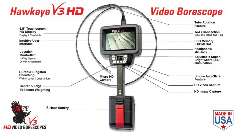 The Hawkeye® V3 Video Borescope features a new Micro HD video camera, and custom-engineered image processor. The 4- and 6-mm Hawkeye V3’s deliver simply the best image quality of any borescope on the market today! Video footage, and still images, captured by the V3 appear crystal clear and with vibrant, lifelike colors. Building on the popular Hawkeye V2 Video Borescope, which was launched in 2012, the new Hawkeye V3 incorporates significant technological advancements, and represents the next generation of video borescopes designed and manufactured by Gradient Lens Corporation. The V3 also incorporates a large, 5.5-inch HD, daylight readable, touch-screen display. The V3 easily displays, captures, and transmits over WiFi, crystal clear High-Definition (HD) video and still images, and does so using a sleek, ergonomic design, superior construction, and intuitive user interface.” The Hawkeye V3 is a valuable tool for numerous manufacturing quality control applications . . . in the QC Lab and on the shop floor. The V3 is also an essential tool for aircraft, and power generation, windpower, and engine and systems maintenance teams. The fully portable V3 provides fast, accurate diagnostics, in mission-critical situations, without the need for costly, time-consuming engine teardown. Interchangeable 90-degree and close-focus optical tips are optional. The smooth servo-driven articulation range is +/- 180 degrees. The V3 can operate continuously for 6 hours without the need for recharging. The V3 contains an integrated, high-efficiency Micro LED light source.